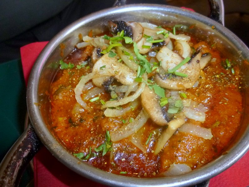 The Waiter brought the dishes, they looked the part, the Thick Masala on both dishes was evident. Jonathan had Mushrooms piled high on top of his Pardesi. My first impression of the quantity was that the serving might be on the small side. The richness of what was set before us removed any further thoughts of this. The flavours simply burst out of the Zaik-E-Dar, well they would with Methi and Coriander, it was off to a good start. The Onion Slices complemented the dish further, this was an amusing moment.