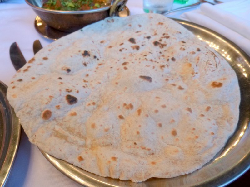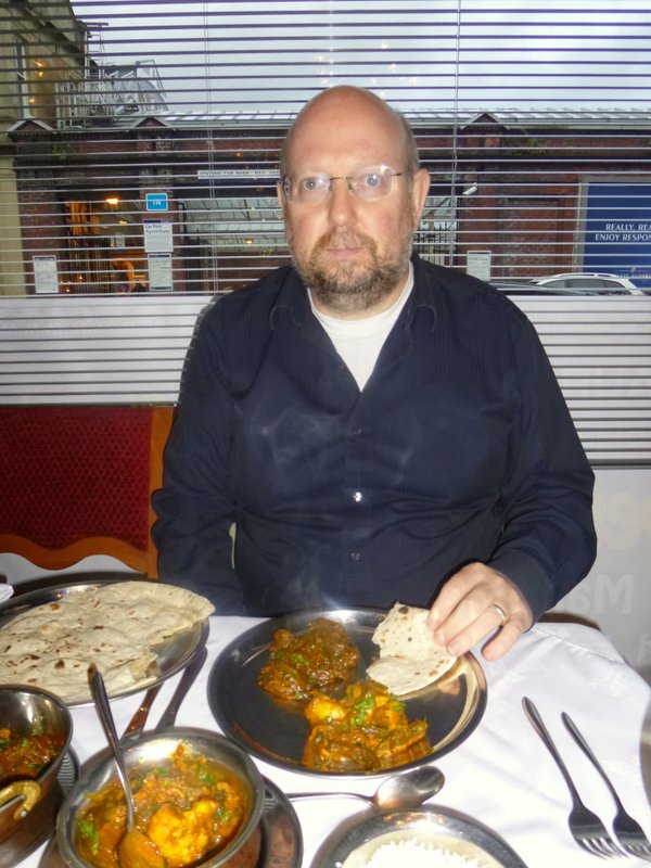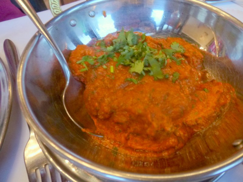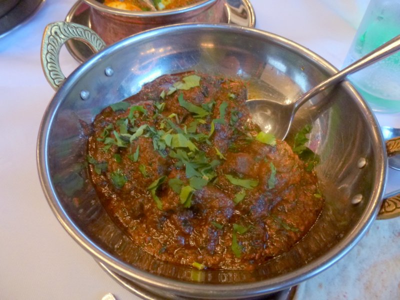 The possibility of Marg joining us later put the Waiter off, his magic recording device had to know immediately how many diners would be at the table, ah technology. Last time I had a Chef’s Curry which did not overly impress, tonight I found Methi Gosht on the Menu, there was more hope. Starters were waived in favour of a Side vegetable Dish. I asked the difference between Mixed Vegetable Curry and Indian Vegetable Curry, the answer literally was – The Vegetables! I went Indian, for a change. One Chapatti (£1.50) felt enough. As is becoming the norm, I asked for the dishes to be as Dry as possible.