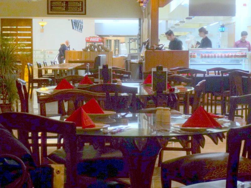 The wait was not a long one, Complementary Poppadoms and Onion Chutney helped pass the time. There was time to take some more photos of the New Village. The food was brought on a huge tray, the Waiter declined to have his photo taken…such modesty?
