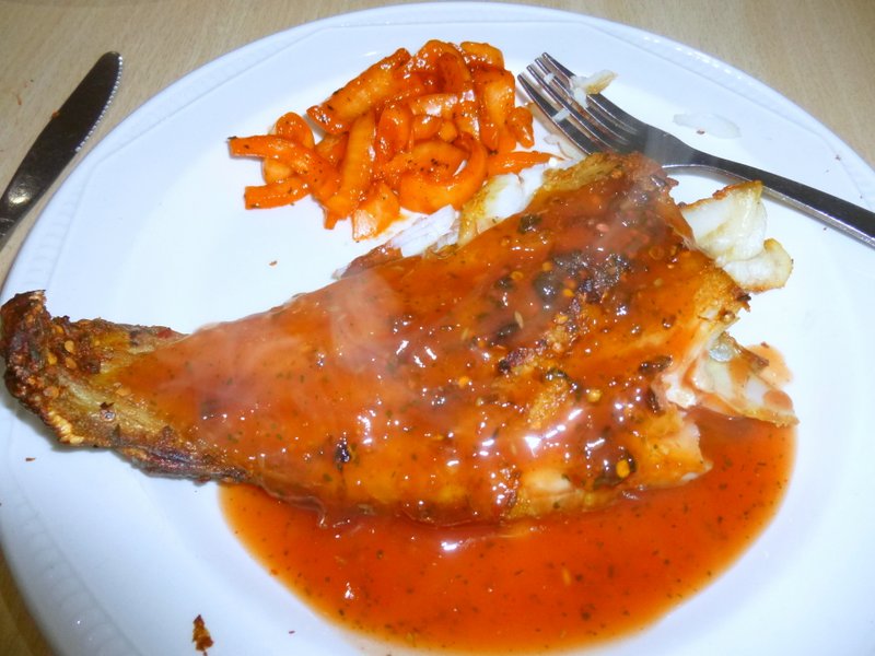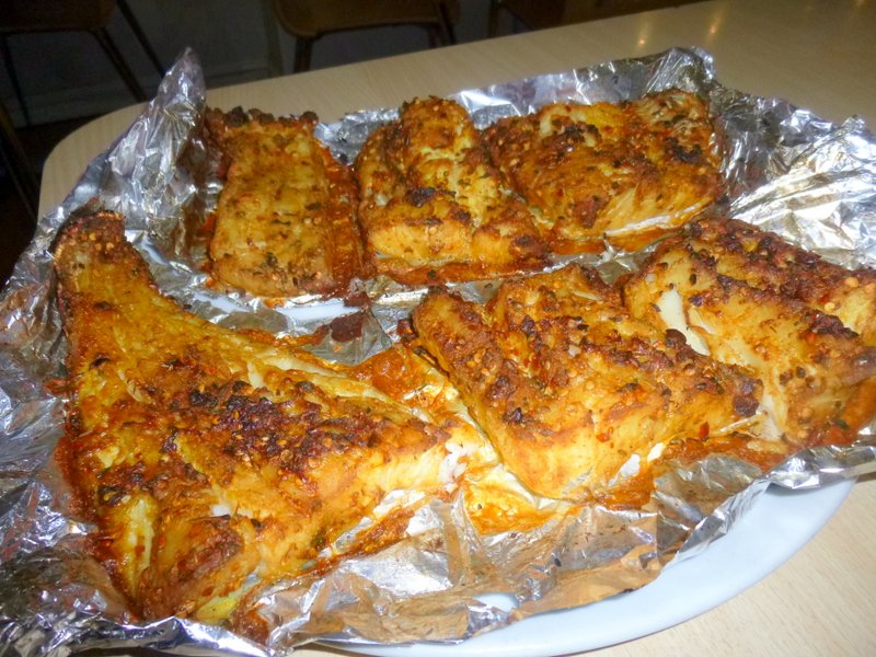 A Tray of Fish sitting on foil was placed at the end of the table – Six Pieces. Scottish Haddock baked in Yadgar Spice, perfect as is, the Hot Sauce added that special je ne sais quoi. A very good Starter – remarked Ricky who was experiencing –Being FedYadgar-style for the first time. We were Four, Six Pieces, Jonathan and Hector declined a share of the surplus, as Jonathan remarked –  I know what’s coming next…