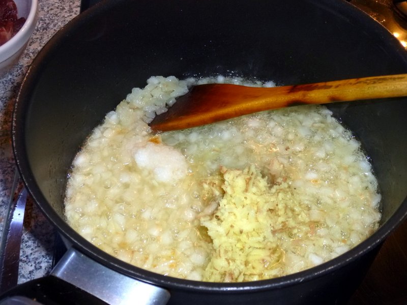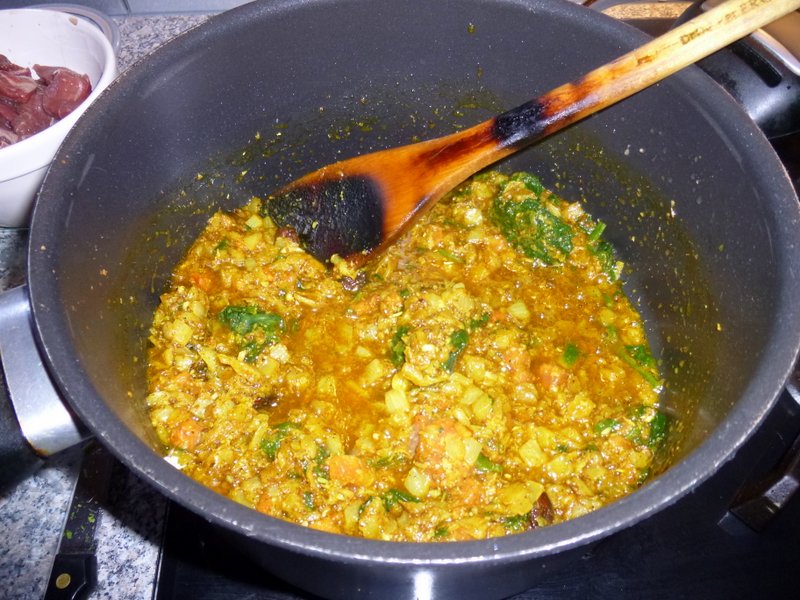 Stirring was required at least every ten minutes. Half a carton of Yoghurt was stirred in Spoon by Spoon with each Stirring. Pre-boiled Potatoes and Fresh Mushrooms were added whilst the Chapattis were heated in the oven.