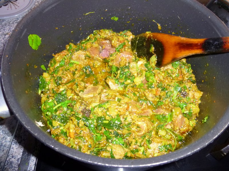 Following the tried and tested method of creating the Masala, the Tomato content was reduced. By not adding a Tin of Tomatoes this also minimised the Liquid. The Methi Leaves, Fresh Coriander Leaves and Stems and Five Blobs of Frozen Spinach were added earlier than ever before. The Masalas I have been eating of late could not have been created by adding these ingredients near the end of cooking. The Mutton, courtesy of KRK (Woodlands Rd, Glasgow) was added as soon as. Time was of the essence, the Meat had to be cooked in an hour. Not really enough for Mutton.
