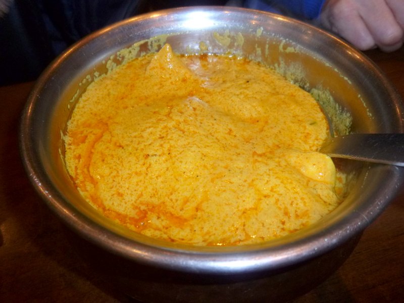Marg received an identical Meat Count in her Butter Chicken. The Masala did look different in texture to the Achari, definitely Soup. It was also, as expected, completely different in taste. I was permitted a sample as always. This was more of a Korma-style dish. However, as Marg would testify it was not simply the bland Coconut based dish served so widely. She described her dish as – Creamy and Filling.