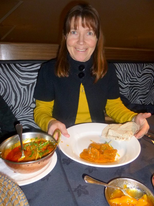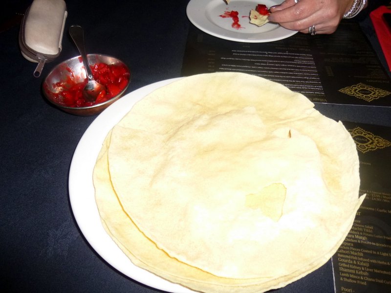 Inspired by the memory of the Lamb Chops at Akbar’s last month we established that a portion of Badscha Chops here was indeed four, for Alan and I to share.  Tracy opted for Fish, the Lahori Machli. Marg was content to enjoy the Complementary Poppadoms but did ask for a portion of Mango Chutney.