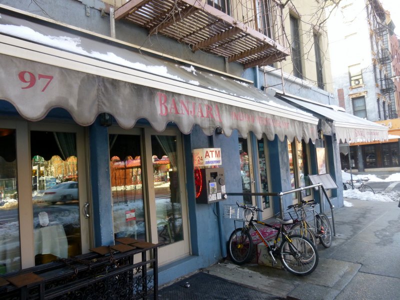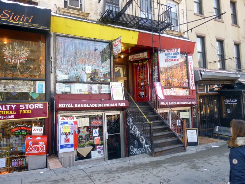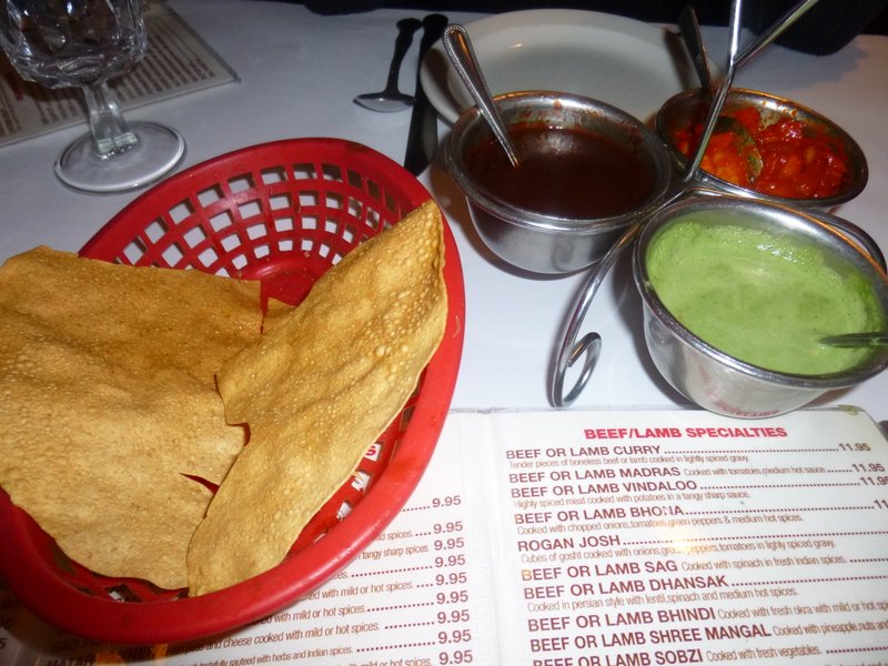 The array of Photos posted at the end of this Blog shows the Curry Outlets surveyed before the choice was made. One Chap described his Menu to us as we passed, the ubiquitous Tikka Lamb put us off. Mein Host from the Raj Mahal (322 E 6th Street, Manhattan, New York) stuck his head out from the Basement Premises and said enough to entice us in. The Complementary Poppadom and Dips, which he hadn’t mentioned,  were on the table as soon as we sat down. We were only Diners this early on a Sunday.