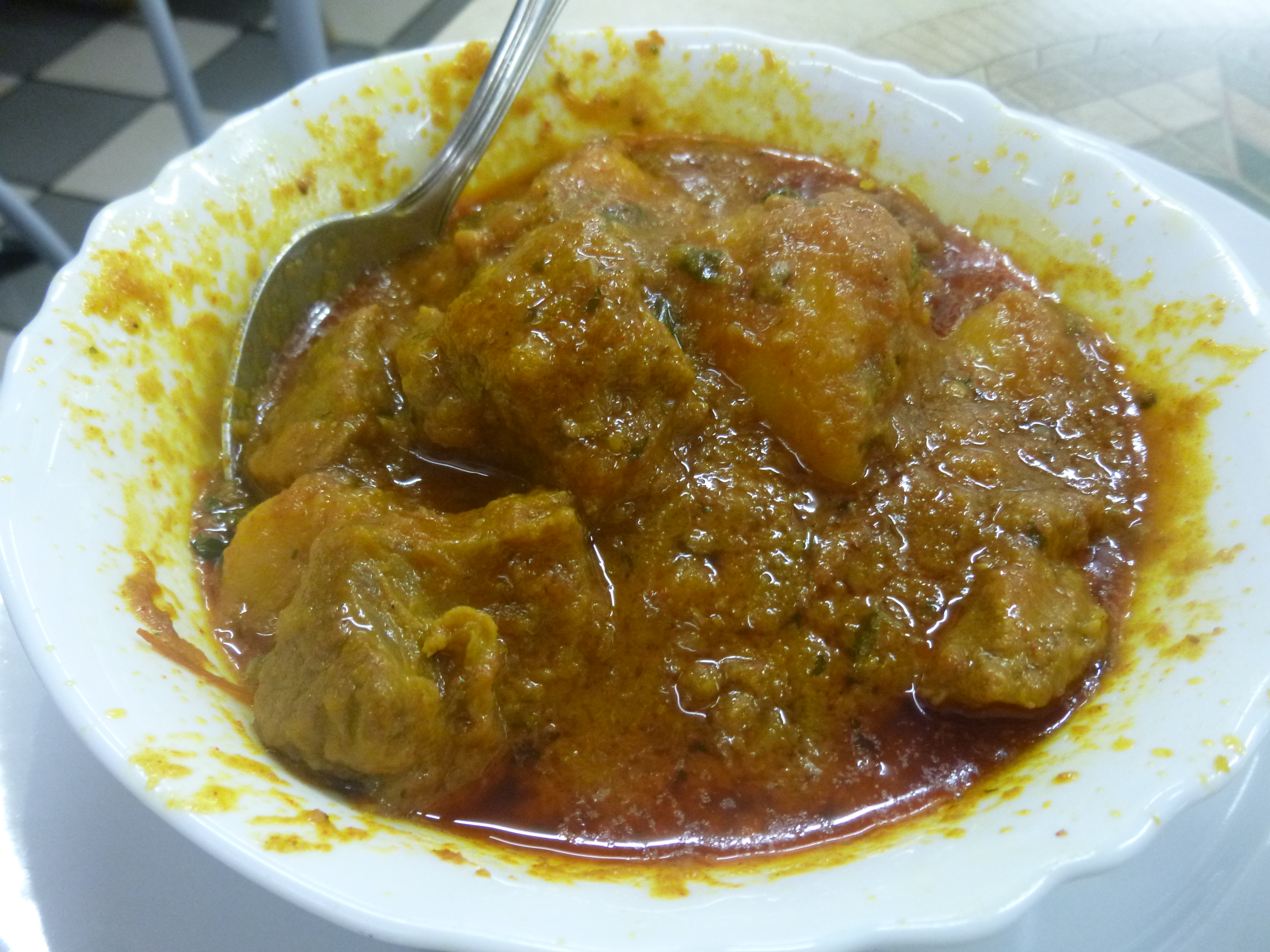 Entering the premises just after 17.00 there was a Chap sitting at the far end getting stuck in to what was on offer. I put my jacket on a chair in the middle of the room making it clear I was here to sit in. Two Chaps were behind the Counter. I hear you serve very good Curry – was my opening remark. There was no Menu available and the Board only gave the Kebab and Pizza Menu. The Curry was on display under the Counter. A Lamb on-the-bone with Potato looked the most appealing. Two more meat Dishes, both Chicken, Spinach and Potato and a Daal Dish were also available. The Seated Chap told me the Chilli Chicken was the Dish to have. I related my preference not to eat Chicken Curry. Meanwhile nothing was coming back from the Servers. Was  The Seated Chap –  The Owner?