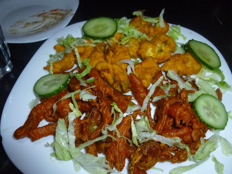 The Starter was presented, half a plate of Onions in Batter, a Poor Man’s Pakora, accompanied by Micro Chicken Pakora. Chicken again, what is happening? With the Poppadoms, Dips, and inevitable bits of Salad, this was already building up to be a Feast, and all inclusive. Eating Curry in Bradford is gentle on the Pocket.