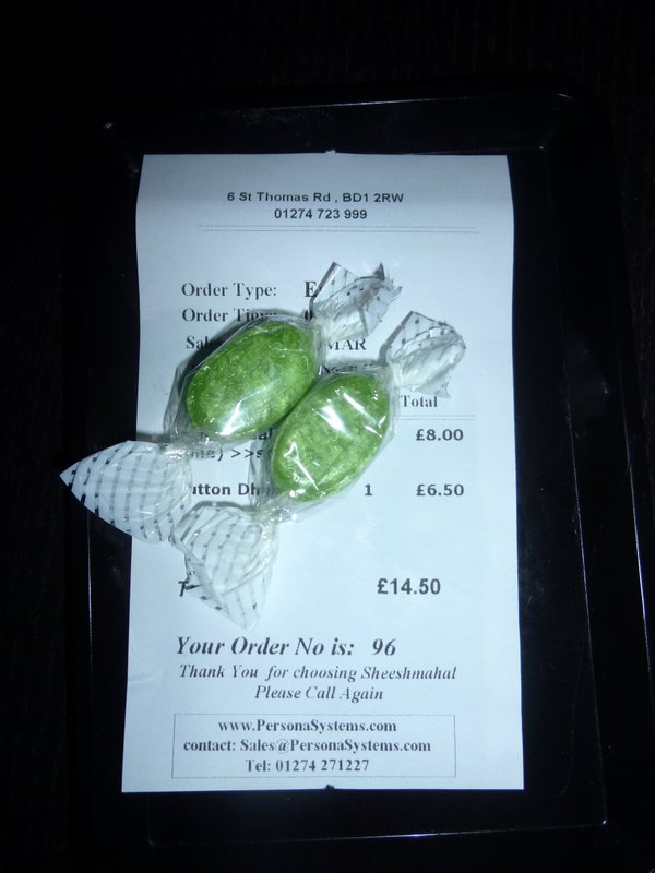 Omar brought the Meals himself, he enjoys the Photographic Opperchancity, I enjoy what he brings. Without the Methi there was not the customary Sheesh Mahal Ultra-Sensation, however, this was still a very fine Bradford Curry. The Lamb was on-the-bone. The Portion was significant, so even with the accumulating Pile of Bones, there was still more than enough of the very Tender Lamb. Having limited my Chapatti intake of late, I was astonished to see the pile go down so quickly, maybe I was hungry?