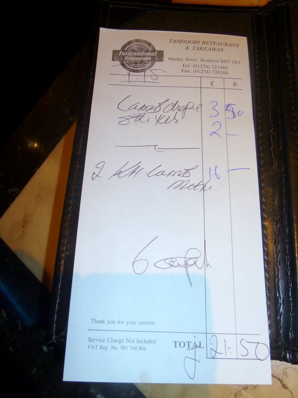 The Bus proved to be the fastest mode of transport back to Bradford. Dr. Stan who has just been Beamed into this Blog Entry could not resist the thought of a Curry at The International. It was the Young Waiters who greeted us and sat us at the very back of the Downstairs Room. An adjacent Large Party were hopefully finishing off. Maybe it is a new phenomenon, but I had never noticed people Bringing Their Own, tonight this was most apparent.