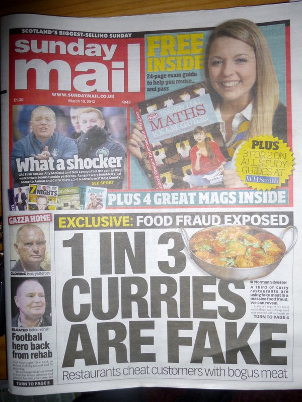 The Sunday Mail had the headline that of the Curry served in Scotland, 1 in 3 are (sic) fake. They quoted a secret report done by food watchdogs who had found 46 instances of Beef impersonating the twice as expensive Lamb in 129 restaurants tested. OK, that may well work out around the one in three mark, but come on… we Chaps know that the Ladies tend towards Chicken, and then there are those who miss out on Meat altogether. One in three is fake? – No chance!
