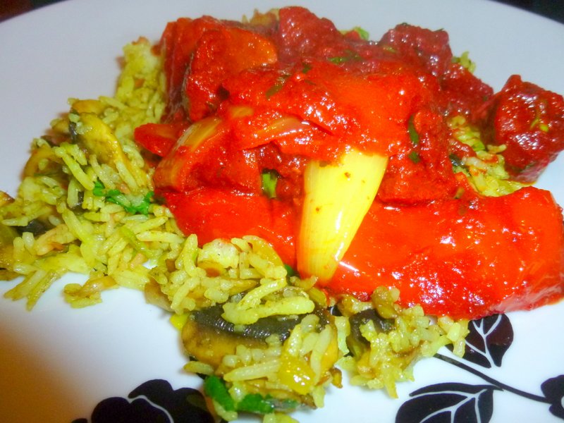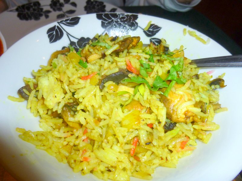 Marg’s Curry was basically a Patia with Nuts on top, and it was Red too. I had to taste it to verify the Masala was not the same as the Karahi, the Tiger Masala was much sweeter. This suited Marg, but one day she will crave Karela and put these Sweet Dishes behind her. Marg found the Bight-Sized pieces of Tender Lamb, and it was definitely Lamb, to her liking. She too found the Mushroom Rice to be the stand-out part of the Meal. (I noted that for a Mainstream Curry, Tender Lamb was not an option, only Beef.)