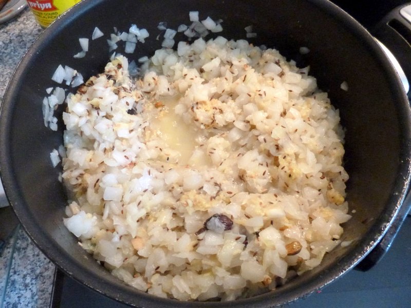 The Masala was prepared separately, as I have tended to do in recent months. Hector’s Lamb Curry for Eight gives a parallel account of the proceedings. Following my Own Basic Lamb Bhuna Recipe with of course a few Tweeks, this would make a worthy addition to the Mutton Brew. Methi Seeds and Cumin Seeds were Cracked in the Vegetable Oil along with both Green and Black Cardamoms. Grating Fresh Ginger for Eight Mouths is taxing enough, hence the Two Bags of Frozen Chopped Onions. It may feel like £2.50 well spent, but KRK were offer 5Kg Bags of Onions for £1.50. Added to the normal Spices for the Masala was some Dried Curry Leaves, the whole Bunch of Coriander and the Leaves and Small Stems from the Methi Bunch. Hector likes Herbs in Curry, it’s a Bradford thing…