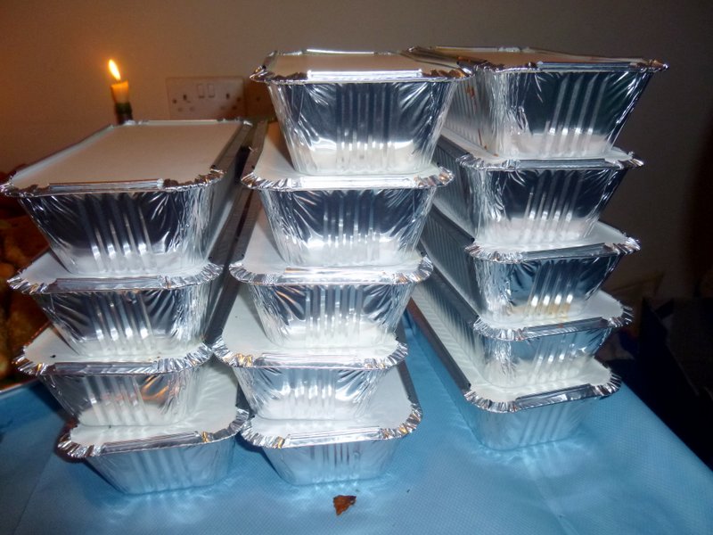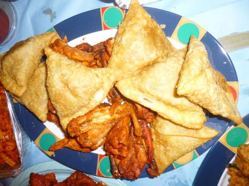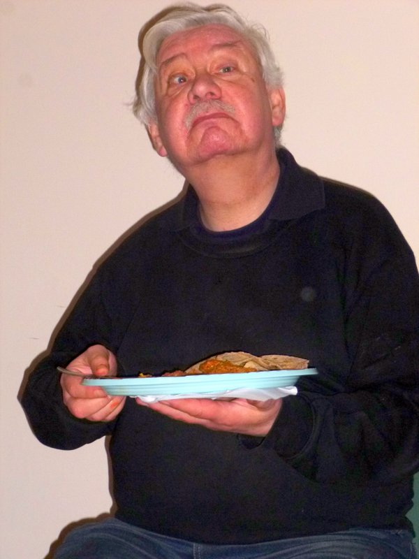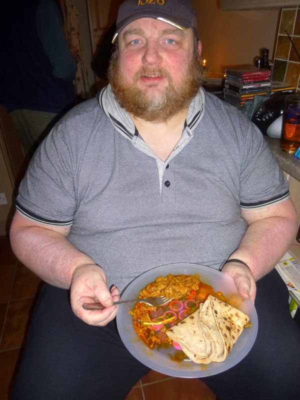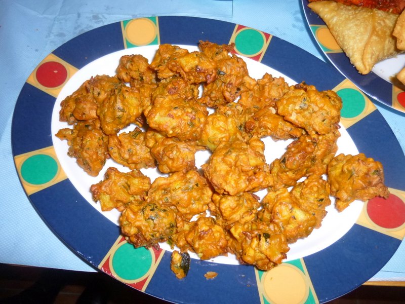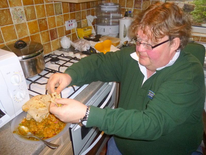 Ricky, the Bradford Curry Guru, and Hector set about carefully piling the Foil Trays, fourteen in all of Goshat Karahi.. Let me state that I am pleased to note the order was all Lamb. No Rice had been ordered, Yvonne was supplying this. A Large Pile of Chapattis was unveiled, enough for two each. Bags of who knows what were opened with vigour. Chicken Chat, Chicken Pakora, Vegetable Pakora, and Samosas. Hands started grabbing whilst we persuaded Yvonne to supply some serving dishes, The Mob was Ravenous.