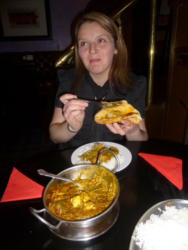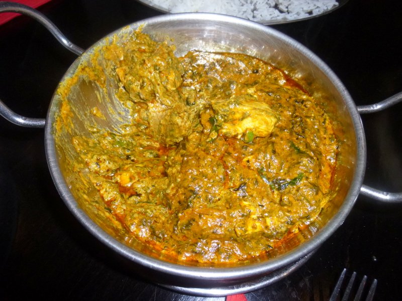 A Karahi with Chicken in a Spinach and Cream Masala was their choice, accompanied by a mean looking Cheese Nan. Chicken Makhani would be close to a reasonable description when the Curry and the Nan combine.