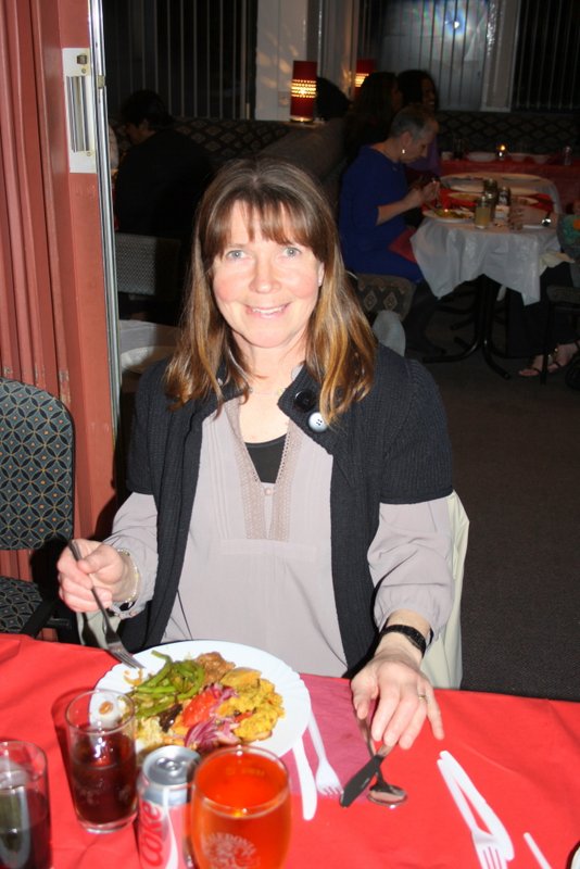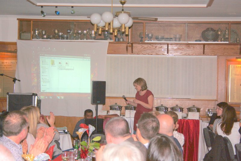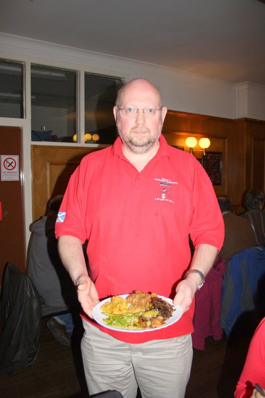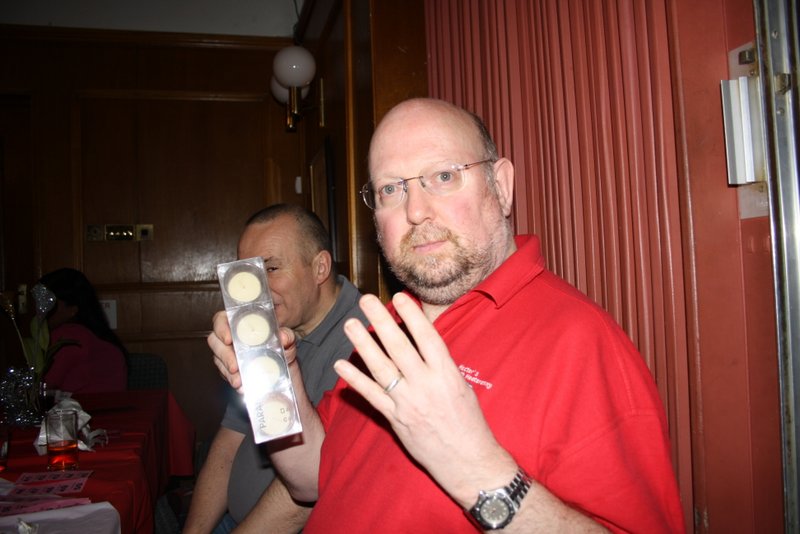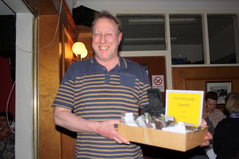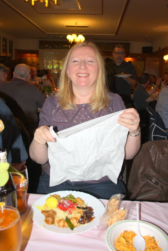 Steve left straight after the meal, the rest of us spread our raffle tickets across the table. Michael won twice, and Eleanor who never wins anything won some Chocolates. At the very end of the draw, Hector went up to blindly choose a package – Fork Handles.