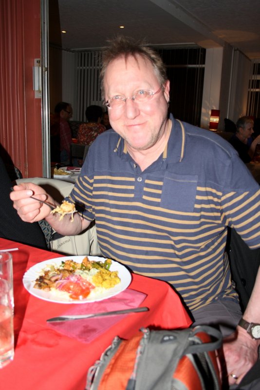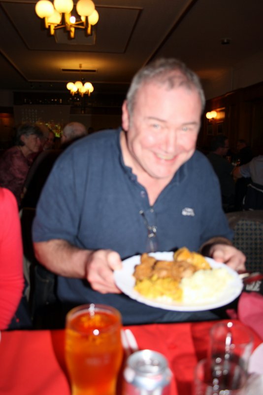 Four of us were served the Starters as we sat down. More would come as the others joined us. Spiced Onion and Poppadoms, Vegetable Pakora and Spring Rolls were in plentiful supply. Last year we were somewhat tentative in asking for more as we did not know the score. This time we knew there would be loads available. We also knew there would be a sizeable gap in the serving of the Starters and the Mains, plenty of time to let the Pakora go down.