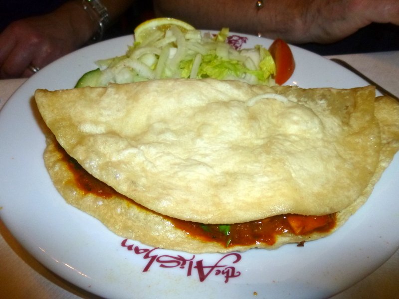 The Starters arrived in good time. The Chicken Chat was four Chicken Wings accompanied by Fresh Onion and Spiced Onion. It kept Marg and I amused whilst we observed Alan and Tracy demolish their Puri. A Curry in a Pancake – was how they described it. I feel we missed out.