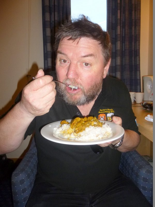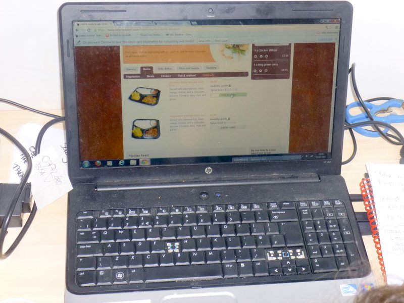 We were stood at the laptop and watched the orders come in on-line. The phone rang every few minutes and so Doris was kept busy processing the orders. I asked the Delivery Chap what happened if they were very late or made errors. He then outlined a discount scheme or the choice of a complementary Chocolate Brownie which he described as – to die for. Knowing that Marg and Maggie would certainly not welcome us back empty handed with this tale, two were requested. For legal reasons we had to go back outside as the Curry was not allowed to change hands indoors. We were then asked for another £6.50 to cover the Brownies. Better be good.