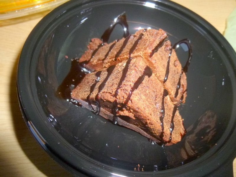 The Brownies. The smallest pieces of Cake sat in the plastic container. £3.25 for this? I have a Pizza brochure sitting beside me as I write, offering four pieces of Chocolate Brownies for £3.29. Nothing special – said Marg. Quite solid, Brownies should melt in the mouth. Hector wouldn’t know, he has never seen the attraction. No Chocolate in it whatsoever – was Maggie’s verdict.