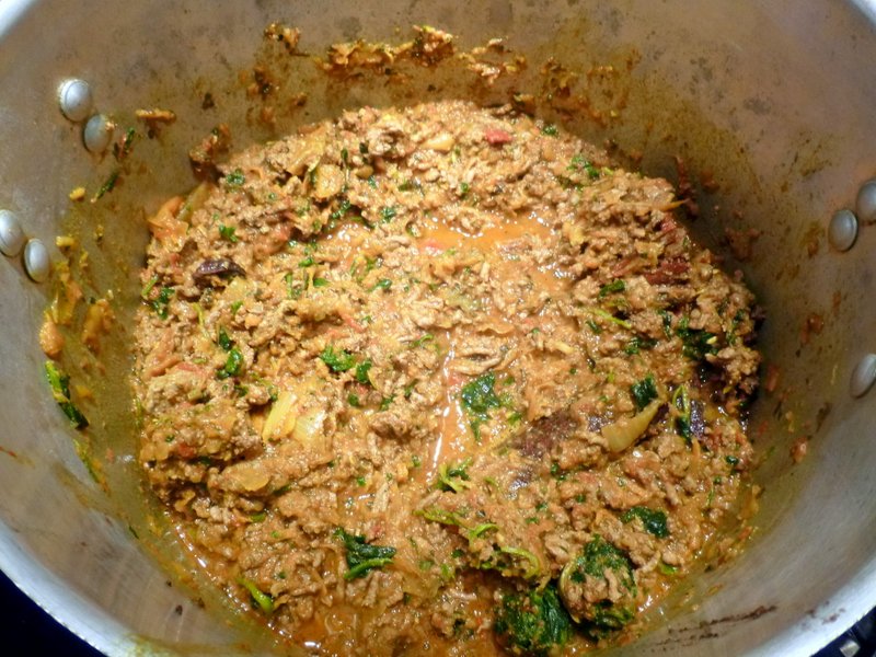 As has become the norm, the Masala was prepared in one pot whilst the Mince was Browned in Garam Masala separately. The Onions were given a full half hour to reach pulp status. Half of the normal Tomato for this quantity of Masala was added to achieve the eventual Dry Texture this Dish requires. Hopefully the Herb content would create the required Speckled appearance.