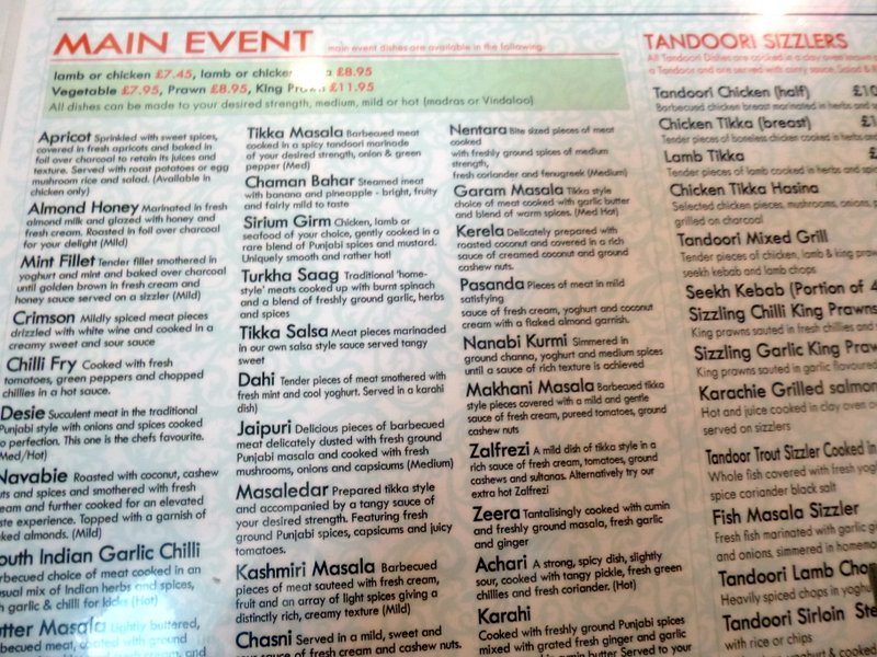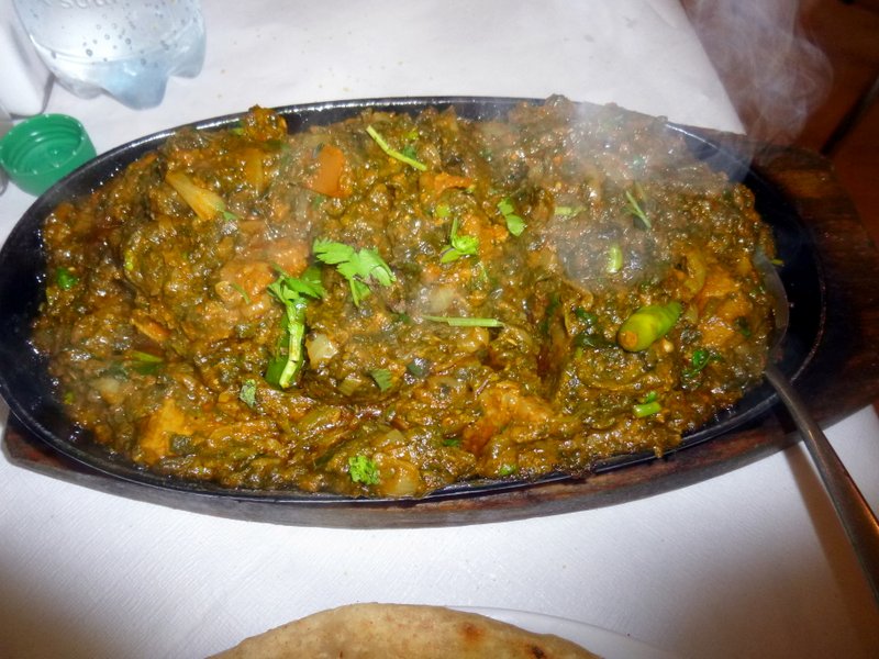 The Menu was on a Laminated Sheet and appeared new. I was given more time and then asked for advice. It was remembered I had ordered the Karahi last time. There was more on the back-side. I was shown the Tava Specials – Desi Palak Gosht, far from the planned Fish,but suddenly feeling attractive. This was agreed (Hot) and a Plain Paratha which I read the Menu as being inclusive in the £10.50 price.