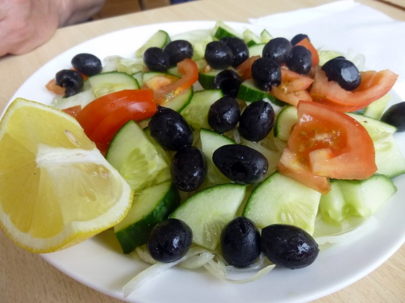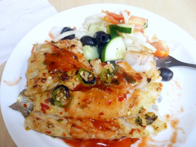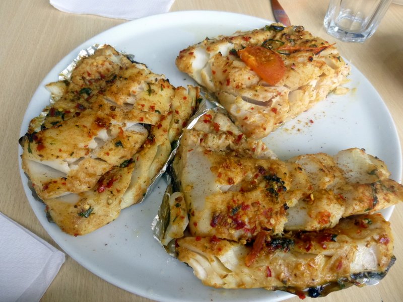Ahmed brought an Olive laden Salad to accompany the Starter. When he laid a plate with massive Slices of Cod in front of Steve he gasped – What’s this? I had advised Steve to eat nothing before coming today, he could now see why. One needs to have starved oneself for Twenty Four Hours do do – Being Fed, justice.