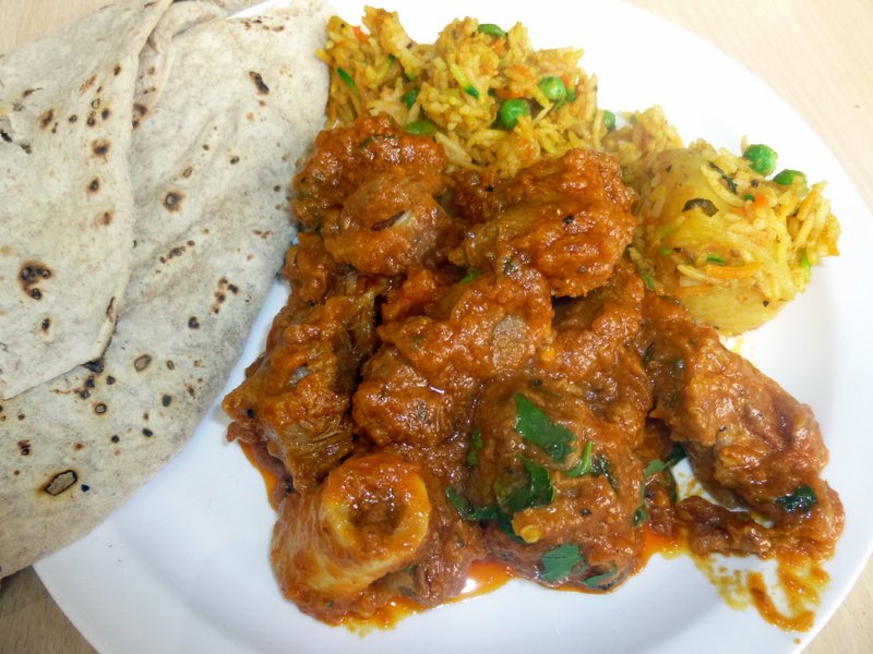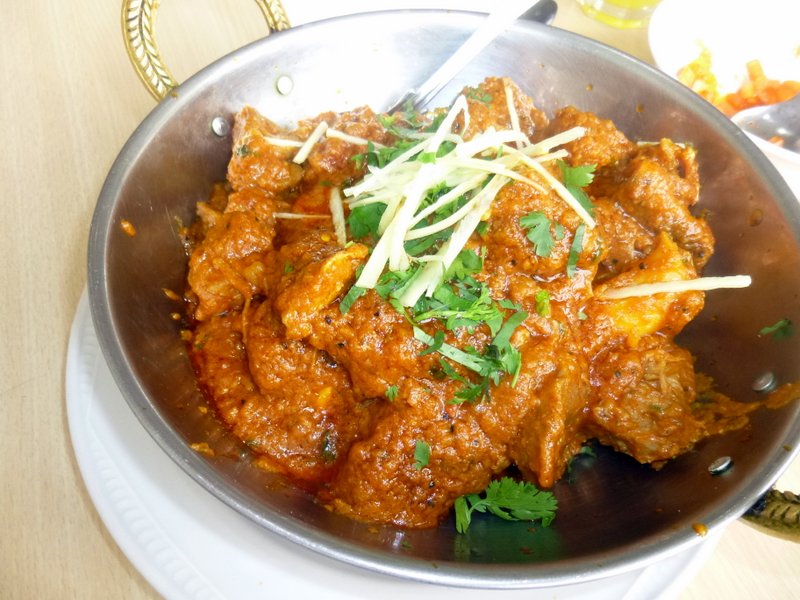 The Vegetable Rice arrived first. Two Portions between five, more than adequate. As is written, this is a meal in itself. Peas, Cauliflower and Potato to the fore. Sufficient Interesting Vegetables. One Large Karahi of Goshat Karahi on-the-bone (a la Hector) was placed at the far end of the table from Hector. Three looked on, I knew another was coming. Three Chapattis on a Basket accompanied the next Karahi, set between Dr. Stan and Hector. They know the score. Steve and Howard would demolish one Karahi, Tracey would assist. Meanwhile when Dr. Stan and Hector felt the Elegant Sufficiency was looming, we could offer any Surplus onwards. And so it was time – To Eat.