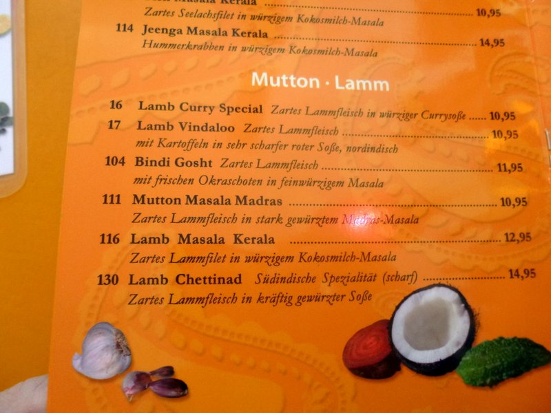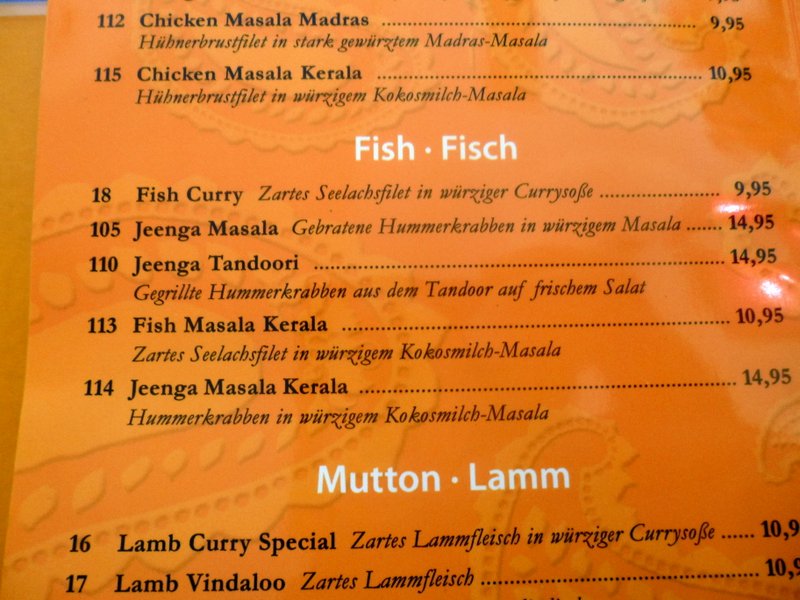 I gave the Waitress the Calling Card and asked her to give it to The Boss. Curry-Heute – she said. Herr Kunjappu was by now seated at the rear of the Restaurant engrossed in conversation. He came across immediately. My Daughter reads your Website and tells me everything. Was the Waitress his Daughter, possibly, but we didn’t interrupt the flow of conversation. I introduced Steve and related how he had spent a Month in München and ended up eating here every day. The Fisch Chettinad was discussed – Nearly my Mother’s Recipe – was his new admission. Jolly is well aware of just how good his Curry is compared to the other Indian Restaurants in München, for the record I have tried four others. With time in München always limited, there is no point messing about, simply head here. (Except over the New Year period)