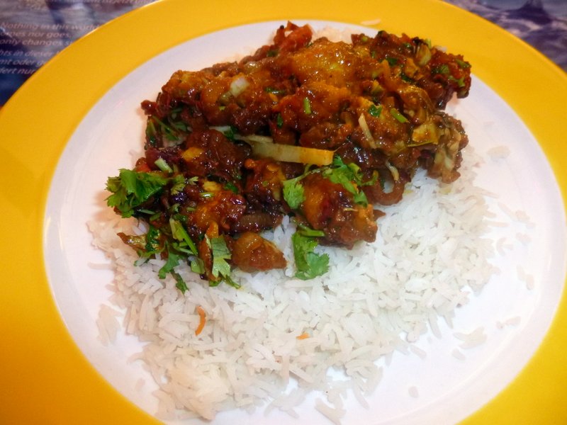 Two Bowls of Boiled Rice accompanied two Bowls of the Driest Curry Hector has seen in months. Both looked Stunning, the Quantity Daunting, even for a Hungry Hector. The Aroma from the Fisch Chettinad was Powerful. The presence of Fish was most apparent. The Dark Red Chillies that Hector associates with South Indian Curry gave off a Smoky Flavour. The Gritty Texture that is the Signature of this Dish came from the Herbs, possibly Coriander Stalks and Chopped Green Chillis. The Masala, what there was of it was packed with Flavour. Even the Fresh Tomatoes had been given a New Dimension.