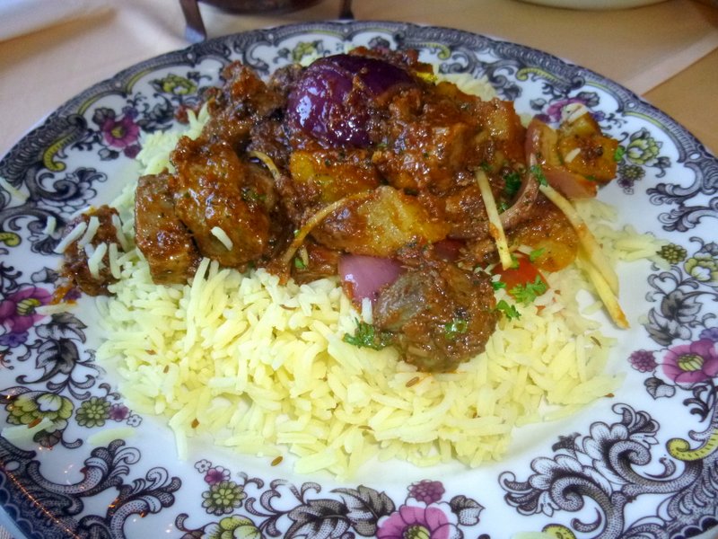 The Curry was Dry, Seriously Dry. Some Ghee had collected at the base of the karahi. The Lamb was cut in a standard size and the quantity was Substantial. A Green Herb was mixed in, Fresh Coriander one hoped. The anticipated Large Onion Chunks were visible, but – What’s this – Potatoes! A First!
