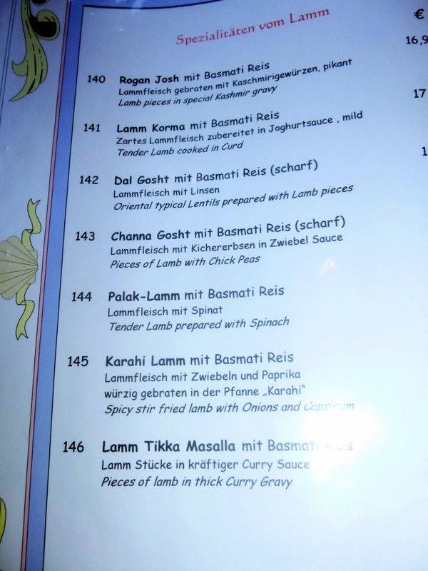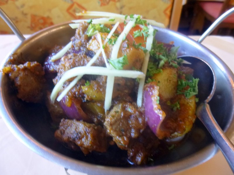 Mein Host and I discussed, in English, the Curry Requirements of Hector. That their Menu described the Karahi as a Stir-Fry put me off a bit. Maybe it does come down to that in the final stages, but there is much to be done to the Meat before that can be considered. I suggested the Lamm Rogan Josh, however, I was told this would have a lot of Masala. Why? Tandoori was suggested. Obviously Dry, but without some Masala it is not Curry in Hector’s Book. We agreed upon Lamm Karahi. I as ever asked for it to be served without the listed Paprika. No Capsicum. Not for the first time I suggested an Alternative Vegetable could be added. In places where I am not known I usually end up with masses of largec cut Onions. Potatoes, I offered as a throwaway. In all my years of ordering Curry in a new venue, nobody has ever taken this on board.