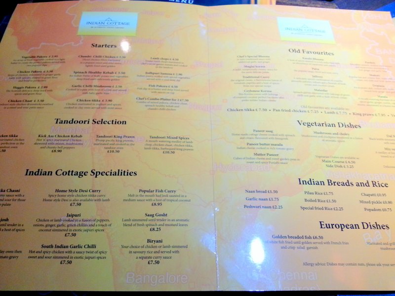 Leaving Blackfriars last night I spotted somewhere new straight across the road from Cafe India, scene of the last Curry-Heute review, so close they even share the same postcode. The Indian Cottage (42 Albion St, Merchant City, Glasgow G1 1LH) is easily missed with the narrowest of entrances and the Takeaway which strangely has a different name occupying the larger street frontage. Until a few months ago this was the Thali Restaurant, one I had never got around to.