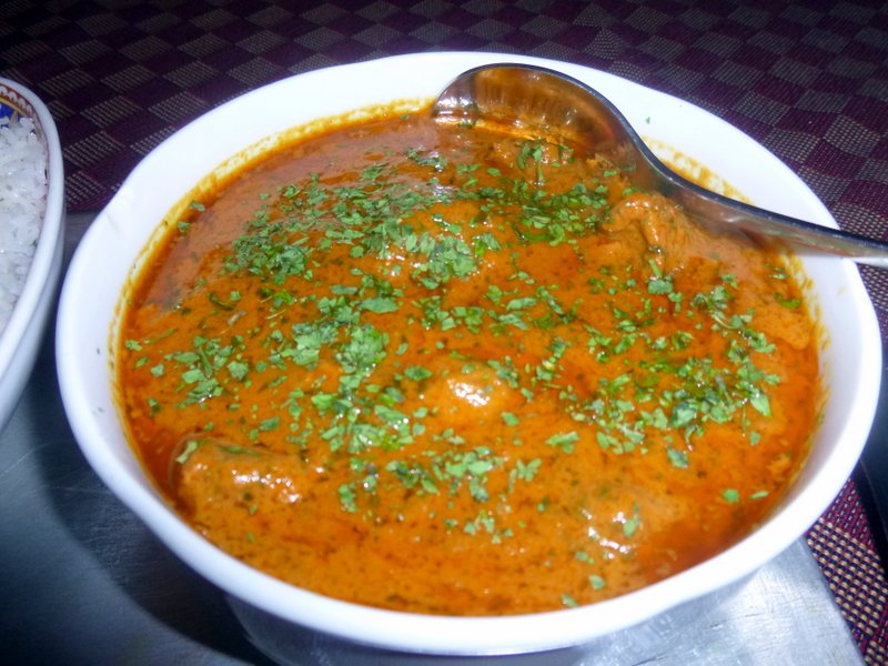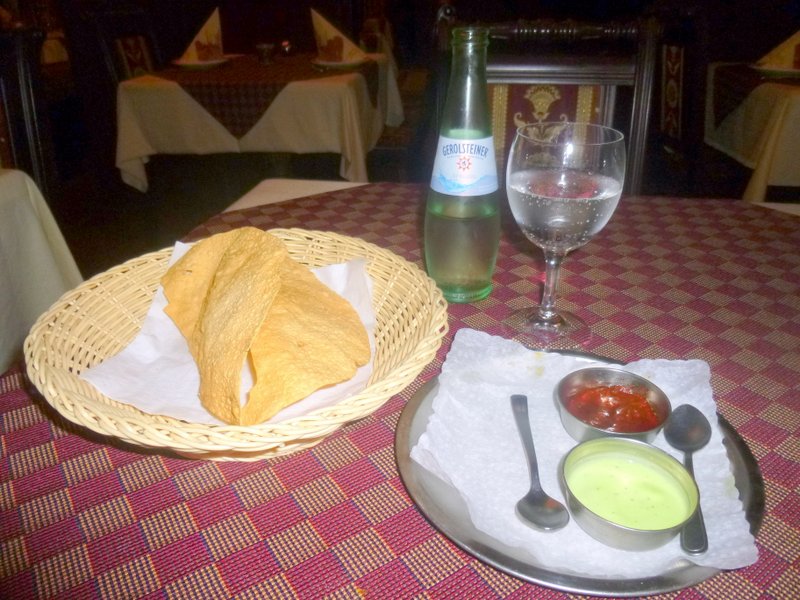 A basket with a solitary Poppadom and two small Dips was set before me. I was advised that the Red one was Scharf. Acutally, we hardly exchanged a word of Deutsch – Hot – then.