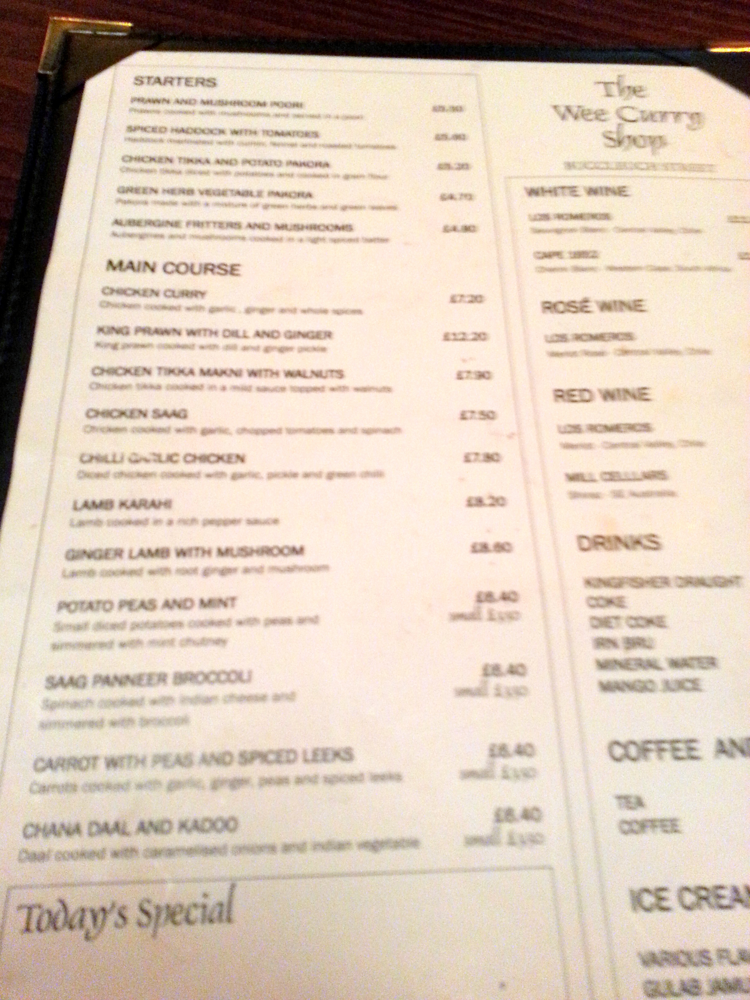 This afternoon was spent at The Drovers Rest, Monk Hill (outside Carlisle). A day trip to Englandshire. Hector, The Lone Diner, arrived at The Wee Curry Shop (7 Buccleuch St, Glasgow G3 6SJ) with quite an appetite. The last visit here was in the first days of Curry-Heute back in May 2010. Hector was then completing a tour of all the Peripheral – Mother India – Curry Cafés and reached a conclusion which was confirmed by the core management. There is a Central Kitchen. Not that I have a major problem with this, however, one always hopes The Chef in an individual restaurant gets to establish The Basics.