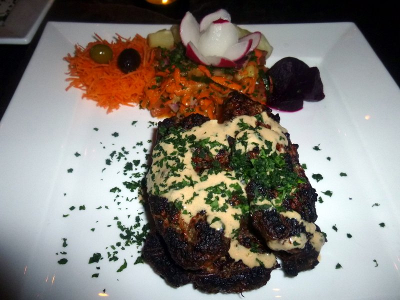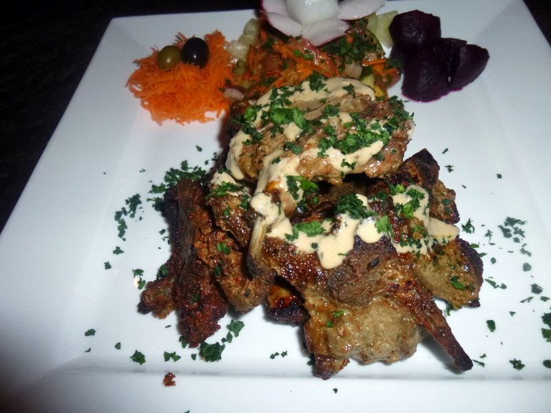 The accompanying Salad also included Grated Carrot, very Kibbutz-like, Olives too, even Cucumber and Radish.. The Lamb Chops numbered eight. They were decidedly Chunky compared to the standard set in a typical Curry House. All the Flavours emerged, Cumin, Coriander. These were Excellent Lamb Chops. The price still hurts.