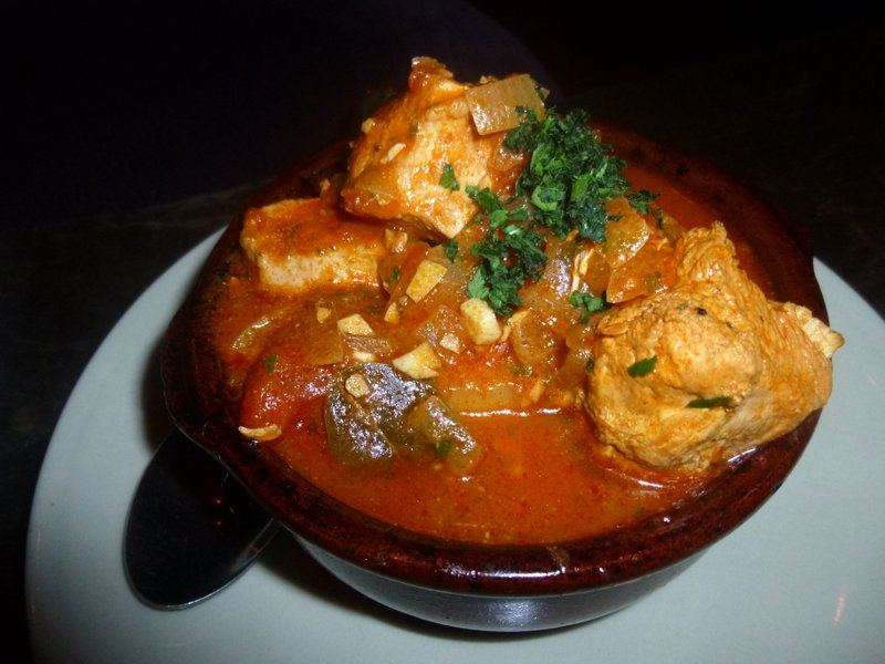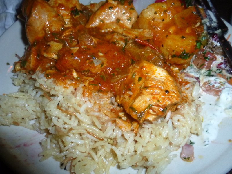 Now regular Readers of Curry-Heute know that I would never order such a Dish, tonight proved why. The accompanying Sauce was pretty nondescript. Red, Mild, nothing to get excited about. The Potatoes were well done, and much appreciated. Hector likes Potato in his ‘Curry’. The Chicken was in quite large pieces. The interior was void of Flavour, the Texture far too Fibrous. This was Halal Chicken? In the end I had to give up. The required quantity of Saliva required to eat the Chicken could not be produced. Half the Chicken Dish and one Kofta went into The Doggy Bag.