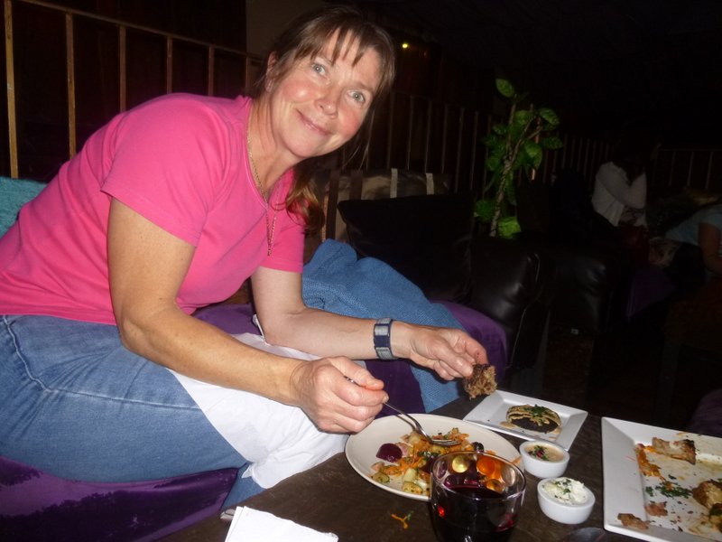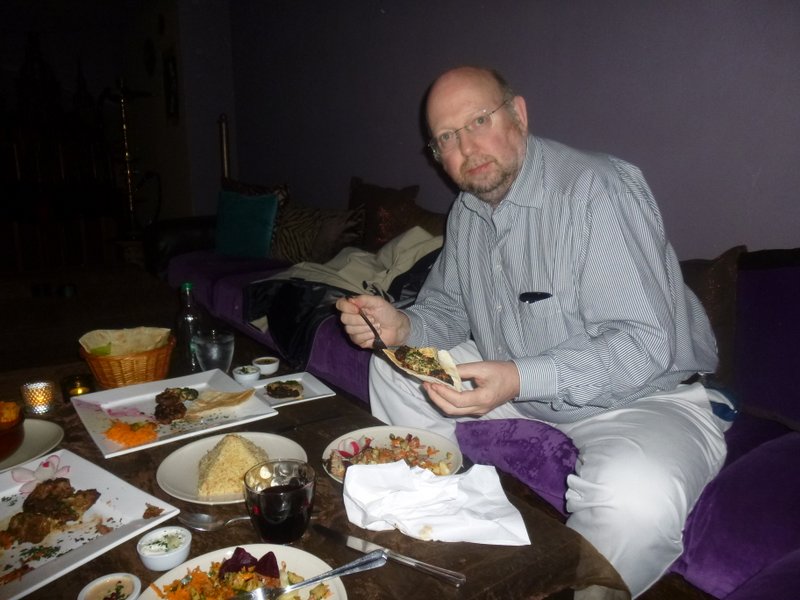Hector arrived first and was offered a traditional table in the downstairs area or the Cushion-Seats upstairs. The latter felt more authentic. I was the only Customer, so far. Marg made her grand entrance by which time the was not convinced The Pharaoh’s Feast would be enough for two. Lamb Chops may be a necessary addition, but at £15.95? Just how many Lamb Chops for this?