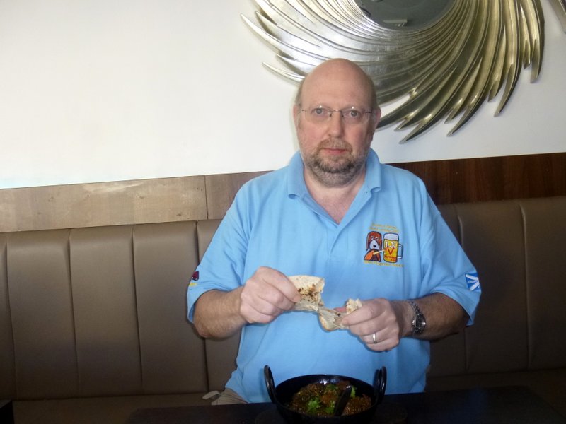 This could well turn out to be a Weekend of Curry Madness, three nights in Bradford. This will mean Copious Quantities of Curry, and one or two ales along the way. Driving South with Robin as Co-Pilot, we arrived at the Sheesh Mahal (6 St. Thomas’s Rd, Bradford, BD1 2RW) mid afternoon. Sadaqat came out to join in the ritual photography. As we took our choice of tables in the Empty Restaurant, he promised me Something Special. Alas he was reigned in very quickly. After Brains, Tripe, Sweet Breads, and Scrambled Egg in recent visits, I was determined to get back to basics – The Wonderful Curry that this venue serves. Lamb on-the-bone with Methi was Hector’s choice accompanied by the standard Three Inclusive Chapattis. Robin played safe and ordered a Lamb Korma again with the Chapattis.