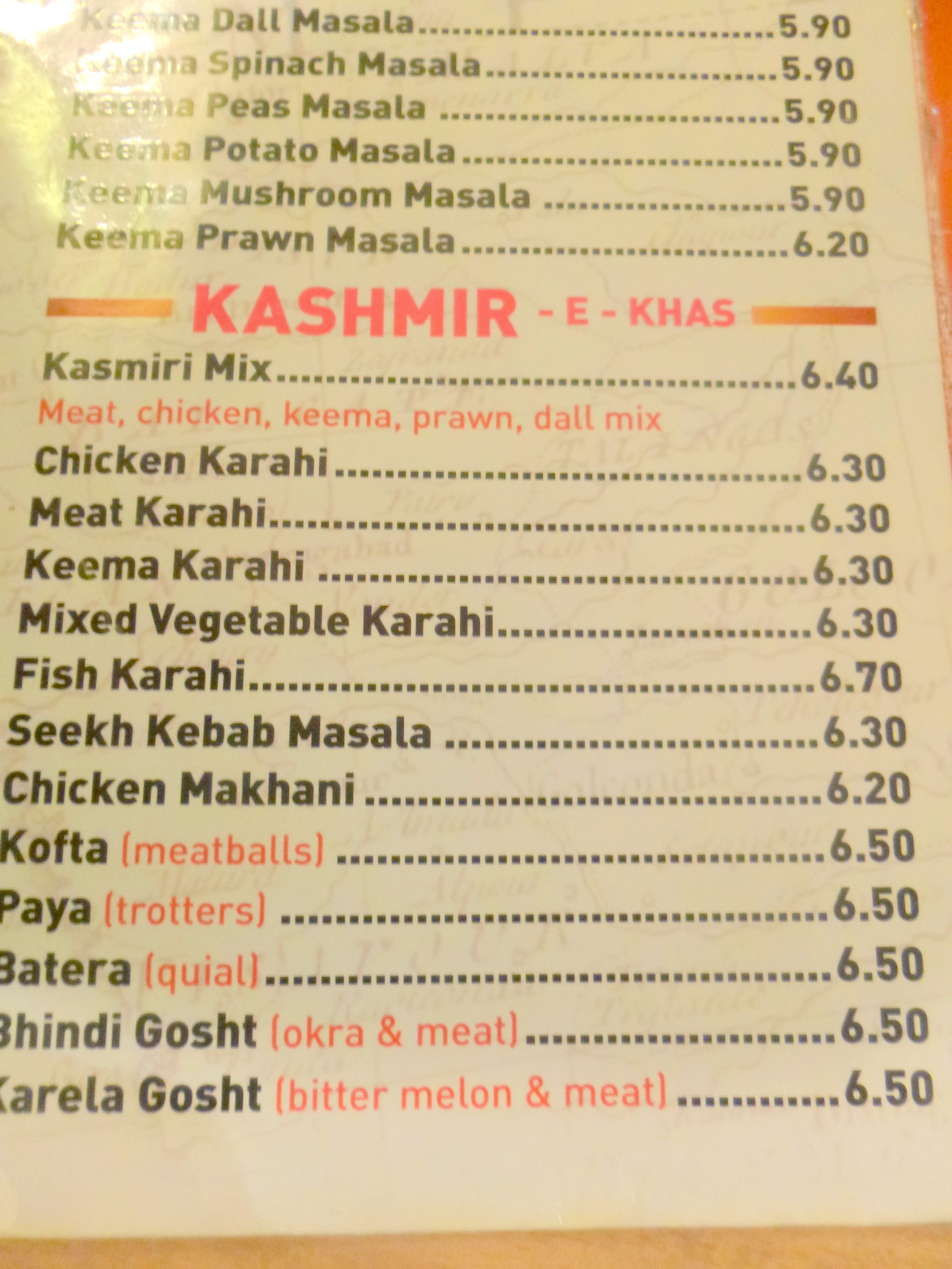The last time Hector visited the Kashmir Restaurant (27 Morley St, Bradford, BD7 1AG) the myth that – it is always open – was busted. 11.00 is as early as they welcome Customers. Clive and Hector entered this morning at 11.15. The Staff were dining together, I felt a bit embarrassed. I knew somebody would have to interrupt their Lunch. The Menu was issued by Mein Host who quickly, and rightly returned to his Food.