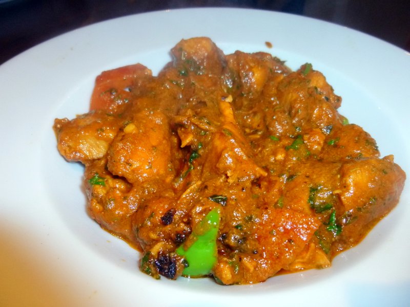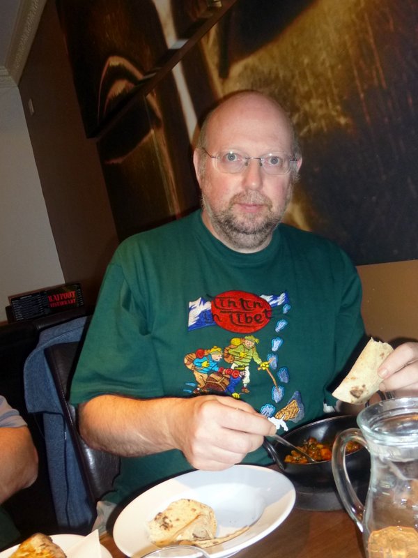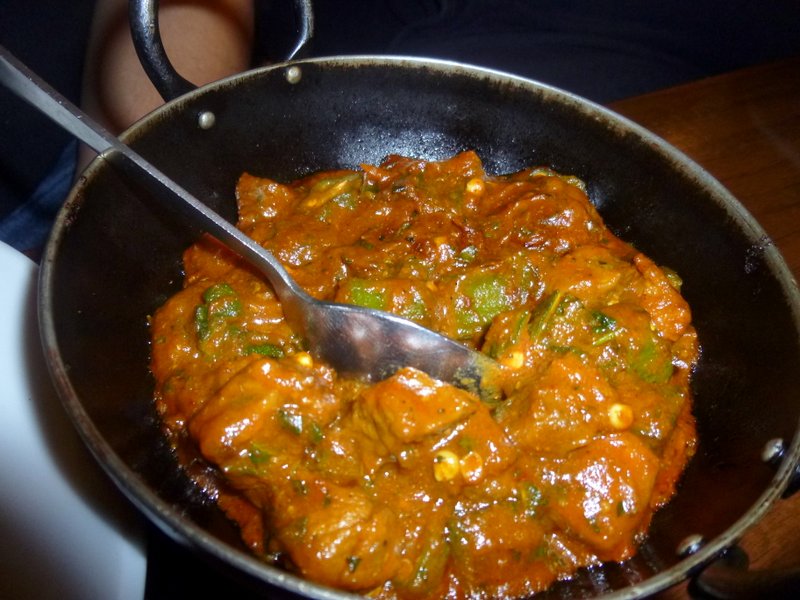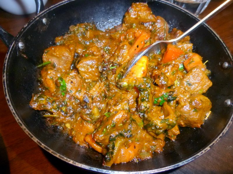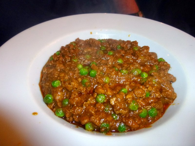 Karella Gosht was on the Menu, Hector had to try this – Bitter Lemon (?) cooked with Meat in Selected Spices, a Strong Bitter Lemon Flavoured Dish, Garnished with Ginger and Coriander. Dr. Stan selected the Bhindi Gosht which is what Hector had last night, Interesting for Comparison Purposes. Jonathan chose one of his Standards – Keema Matter (sic). Nine Chapattis would accompany these three Dishes.