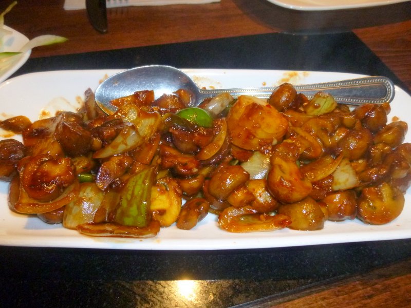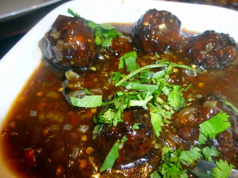 On my first visit Clive had arranged for us to have this Starter as a Main Course. Dry Lamb Tikka which dances on the palate. With anticipation leading to salivation, this would have to be Hector’s Starter of choice. One might also trace the appreciation of Lamb Chops back to this very venue. Hector had never ordered totally Dry Meat prior to his first visit here. Marg considered a share of this but then the candidate changed allegiance and gave in to an Indo-Chinese Starter involving Vegetable Balls and a Chilli Sauce – Veg Manchurian. An Indo-Chinese fusion recipe mixed vegetables formed into balls then fried & lightly tossed with onions, ginger & garlic, soya sauce. No Cheese then as I had thought whilst glancing at the menu. Maggie fancied Garlic Mushrooms, and surprisingly, Clive asked for Shami Kebab, even though it was not on the menu. He knows, you know.