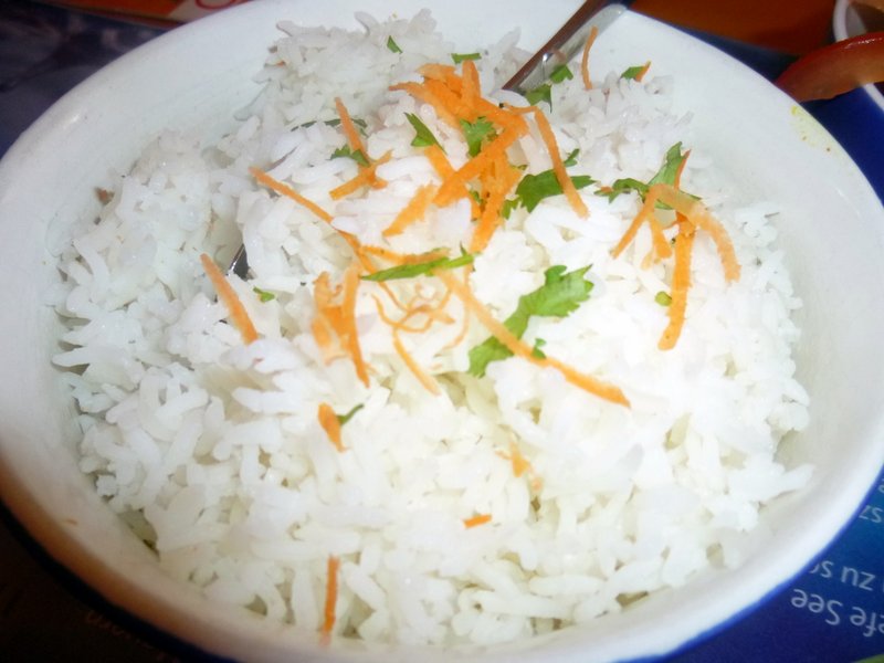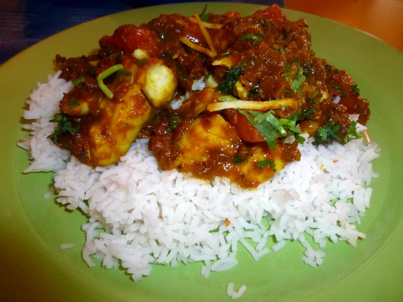 The wait was the Square Root of One Robin, not long at all. Mein Host brought the Bowl of Chettinad and one of Basmati Rice, – Gosh! The Fish was piled even higher than it was yesterday. A quick peak below revealed a Mass of Fish with the Thick Masala wrapped around it. How am I going to finish this? The secret was to only decant half of the Rice.