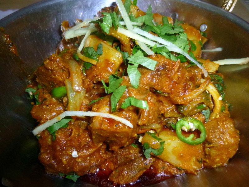 The Joy of the pre-ordered Curry was manifested. Naveed brought a Karahi before the Salad had disappeared, not the Single Portion one but the Larger One. A full Half-Kilo, but on-the-bone, so potentially within the Capabilities. However there was a Potato Presence. An entire Field of Potatoes had been cleared in the preparation of this Curry. More than the Half-Kilo.