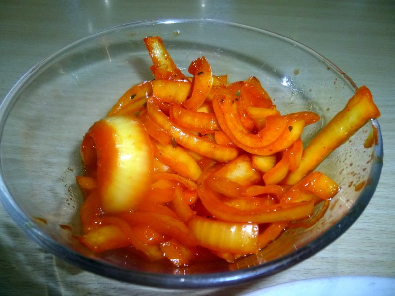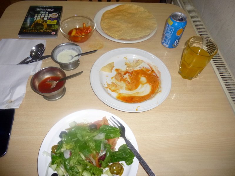 Three Poppadoms, Two Dips, One Bowl of Spiced Onions arrived very quickly. There was even an apology for the late arrival of the Superb Yadgar Salad which features Pickled Chillies, Black Olives and more. The Table was covered in Food, a certain DVD had to be featured.