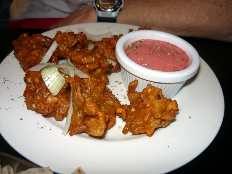 Marg had eaten and so a Vegetable Pakora was all she desired. Two Chapattis to Accompany the Mince. Complimentary Poppadoms and Spiced Onion were brought with a sense of Immediacy.