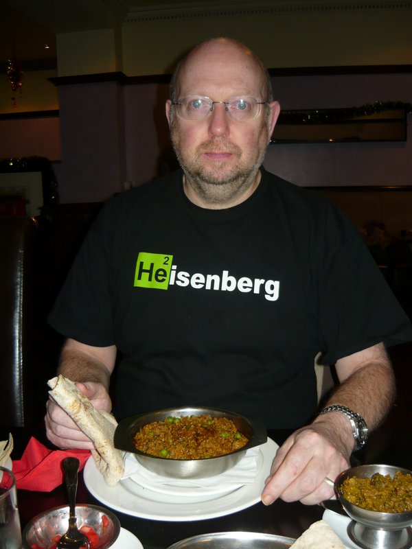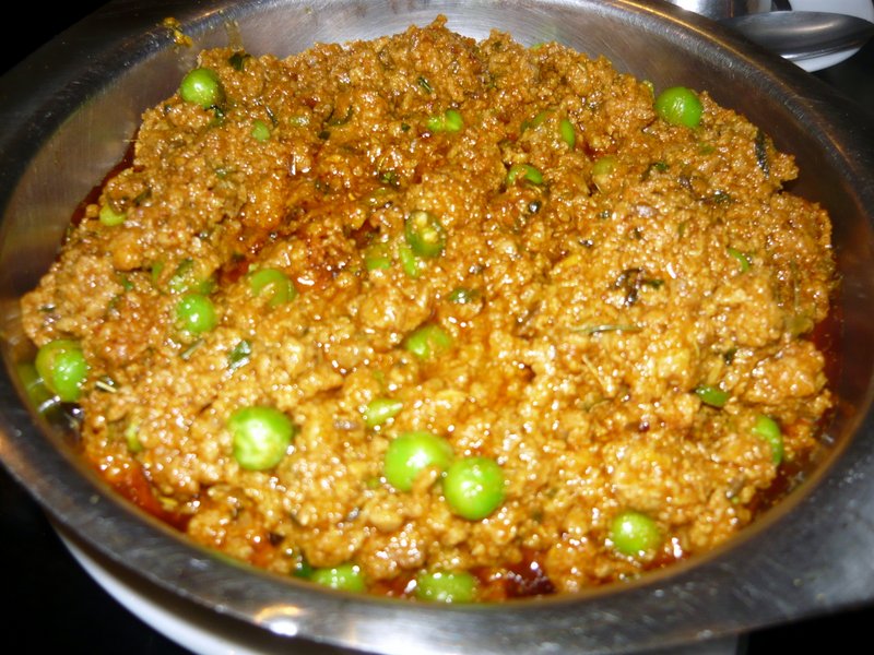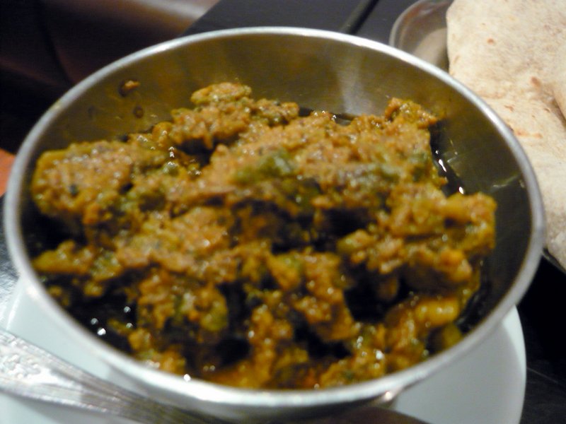 The Main Course came just as I was finishing. Hari said he would bring – Something else – too. This was a small Dish of Something Cold. I could Taste the Pickle but could not identify what the Main Mush actually was. It was Karela Pickle. I have some in my Fridge, I would never have eaten this Raw/Cold. I stirred some into the Keema Mutter which was still Piping Hot. The Excellent Chapattis scooped up the Mince and Peas, this was Fun. Meanwhile Marg had polished of her Pakora.