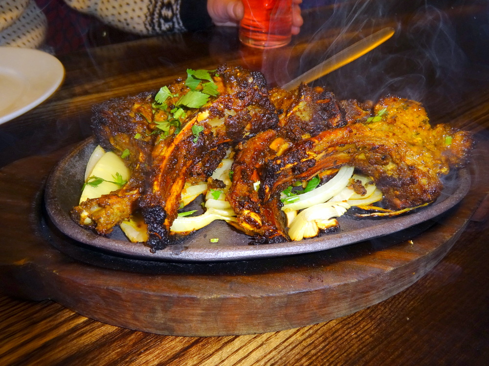 The food is brought on trays, we watched three other tables being presented with their Orders, then it was time for the Lamb Chops. Five Chops per portion, but check the Girth. These are not the standard served at the majority of venues, these are in effect double thick. Sizzling on the platter, presented on a bed of Onions, this is one of life’s greatest pleasures. To think some Curry Houses serve Lamb Chops on a plate.