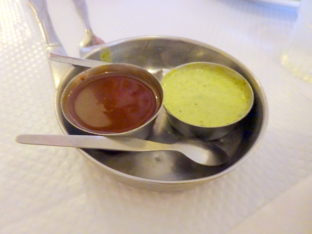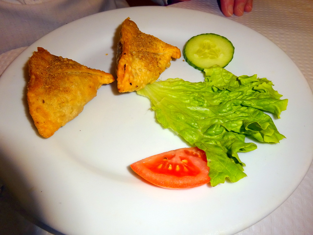 Marg’s Samosas looked lonely on the plate despite the Garnish. The two Dips which has been brought earlier now had a purpose. Marg devoured the Samosas quite quickly then used the Raita to make her share of the Paratha more interesting. Marg was content: