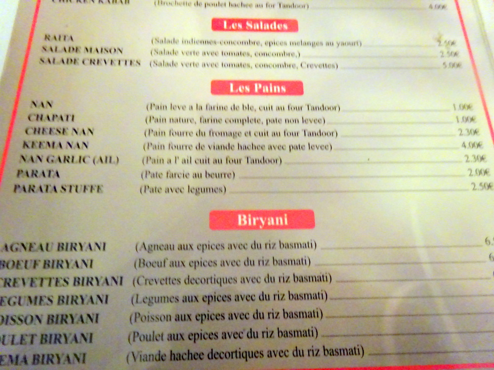 The Menu was simple, basic, excessively so. Specialities? – where? I might have rescued the moment by looking more closely at the Beef section, at least Keema Matar (€6.00) and Keema Allo (€6.00) were on offer. Hector as ever was trapped by the Lamb, Agneau Madras (€6.00) it would be. Parata Stuffe (€2.50) could not be ignored. As Rice appeared in a separate section I assumed it was not inclusive. I missed the statement: Tous les plats sont servis du riz.