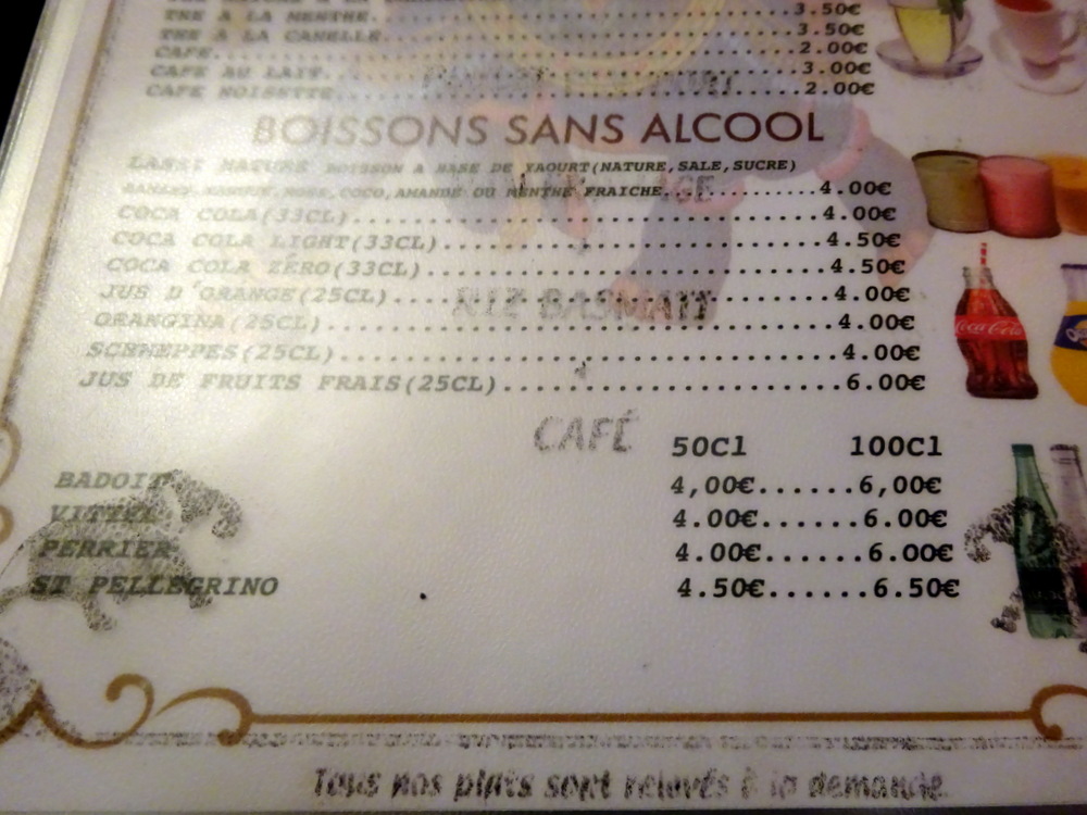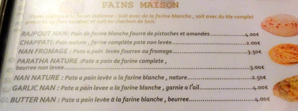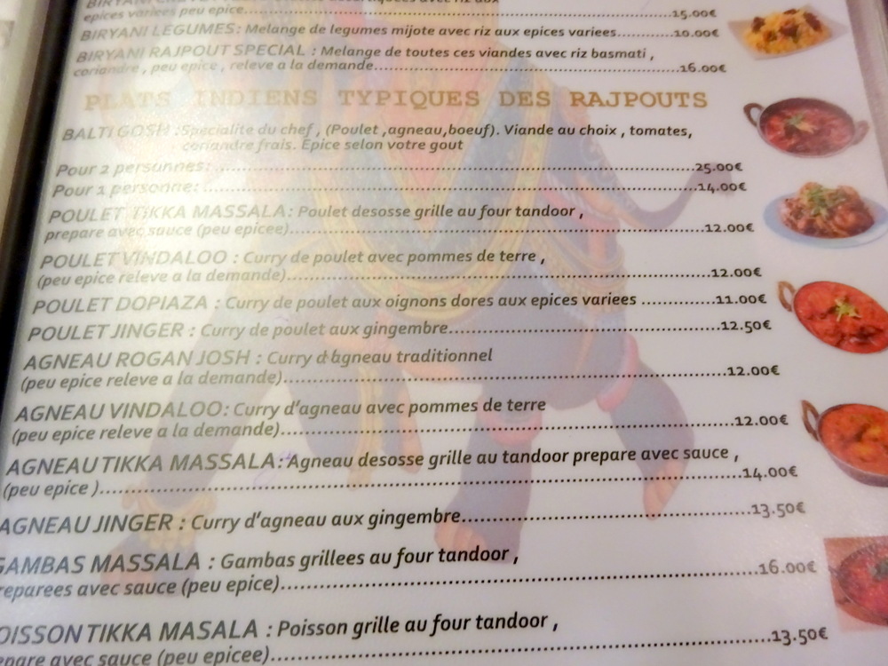 We were shown into a surprisingly small room which was connected to another by a narrow passageway. Menus were provided, as I took my photos I tried to make sense of the layout, the Dishes were all over the place. I nearly changed my mind and have a Fish Curry of some sort, but then decided to stick to the plan. Hector has not had a Lamb Curry in a Formal Restaurant in Paris this trip.